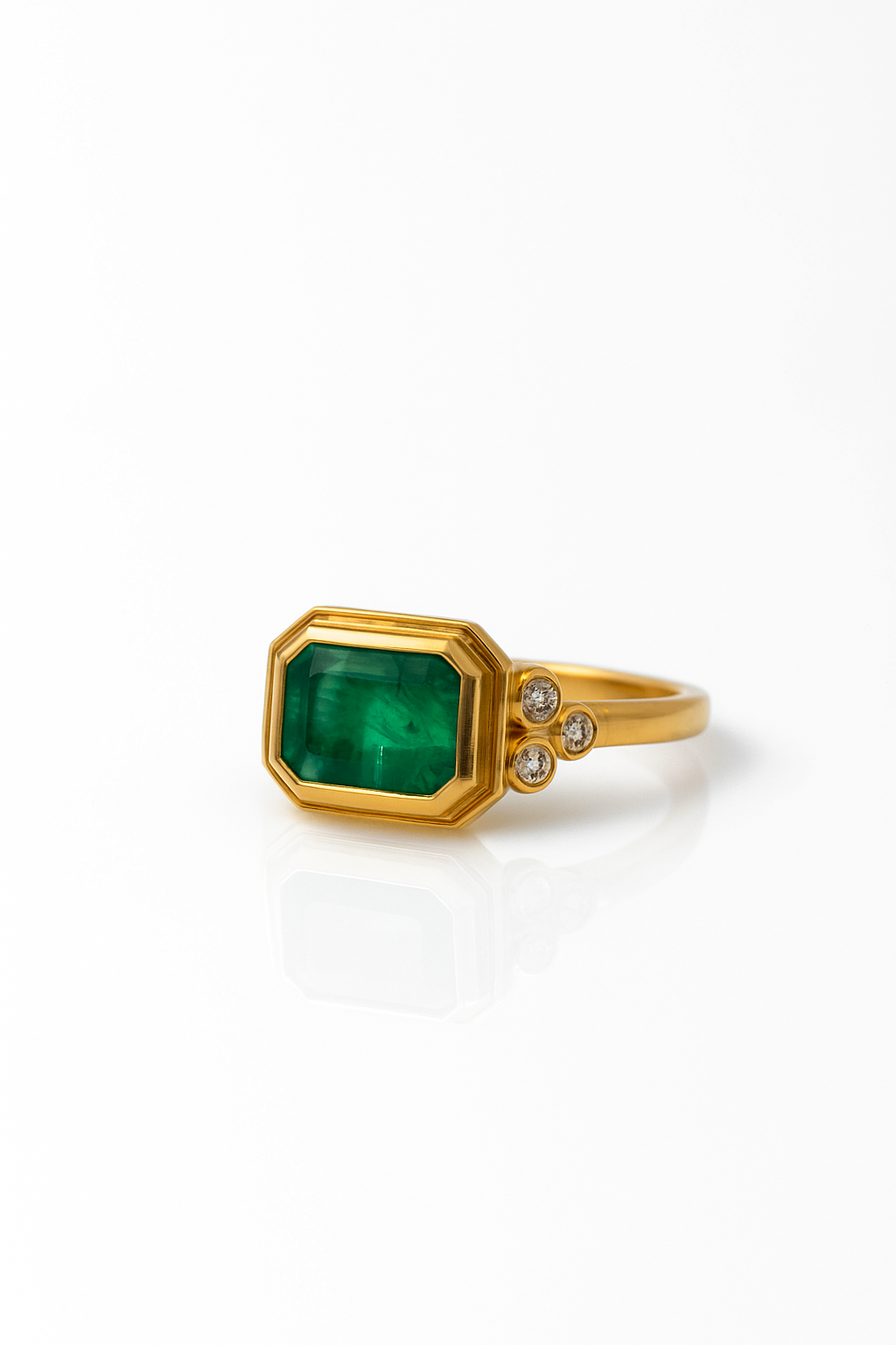 A modern ode to timeless elegance. This exquisite ring features a richly saturated emerald, bezel-set in glowing yellow gold to honor its regal depth and natural brilliance. Three delicate diamond accents cascade along the side, adding a whisper of sparkle and sophistication. A harmonious balance of bold color and refined craftsmanship, this piece embodies legacy—designed to be cherished, celebrated, and passed down through generations.