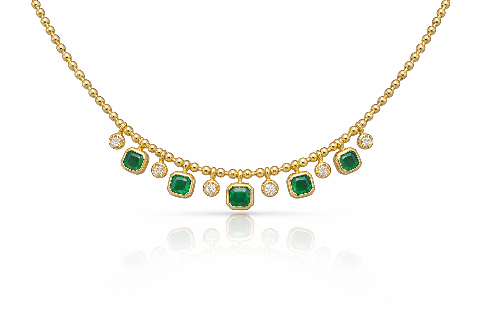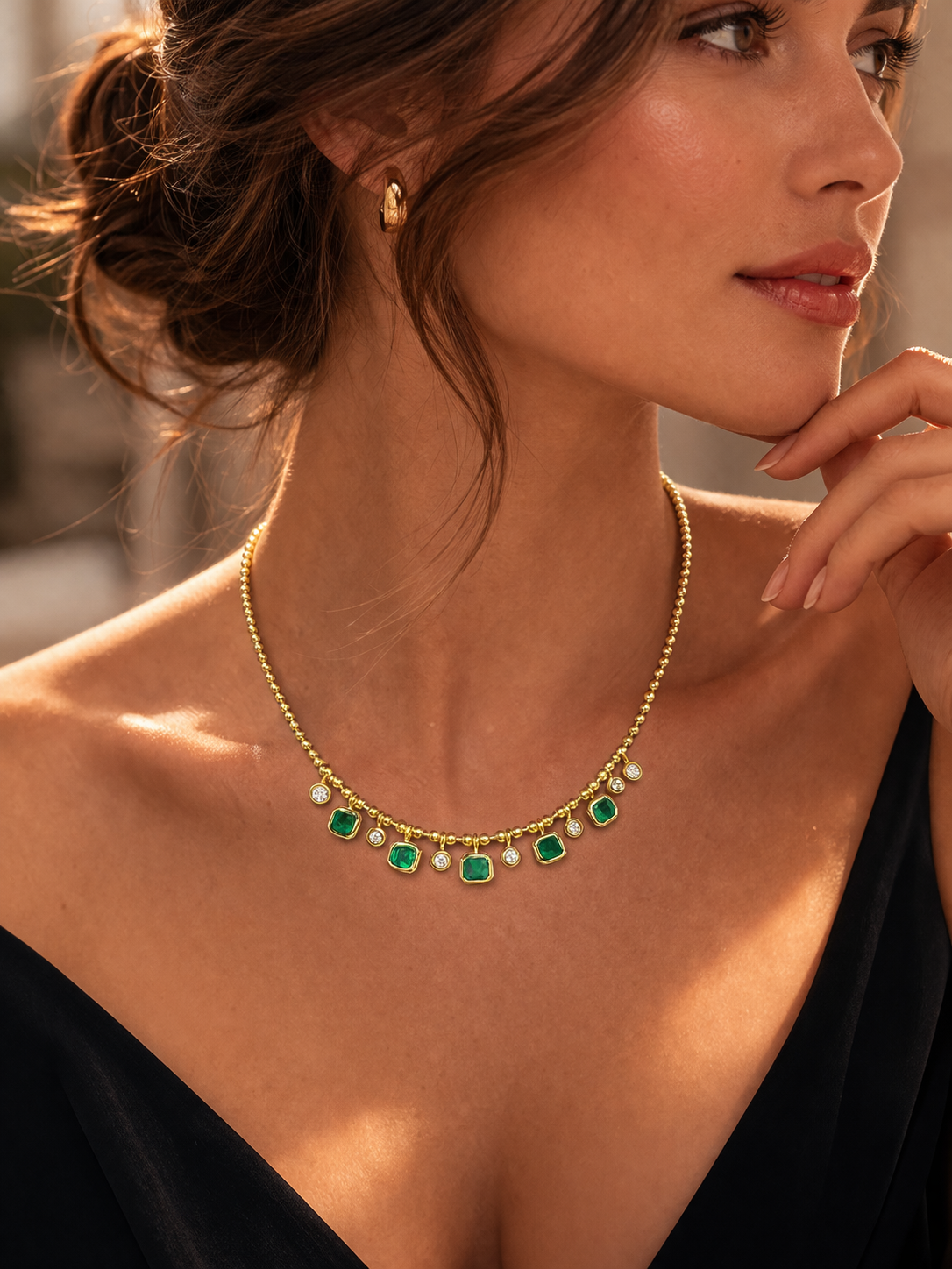 Refined, radiant, and undeniably timeless — the Verona Emerald Cascade Necklace captures the essence of modern luxury with a nod to classic European elegance. Handcrafted in rich 18kt yellow gold, this exquisite design features a delicate row of vivid green emerald-cut stones, each gracefully suspended alongside brilliant-cut diamonds that shimmer with every movement.