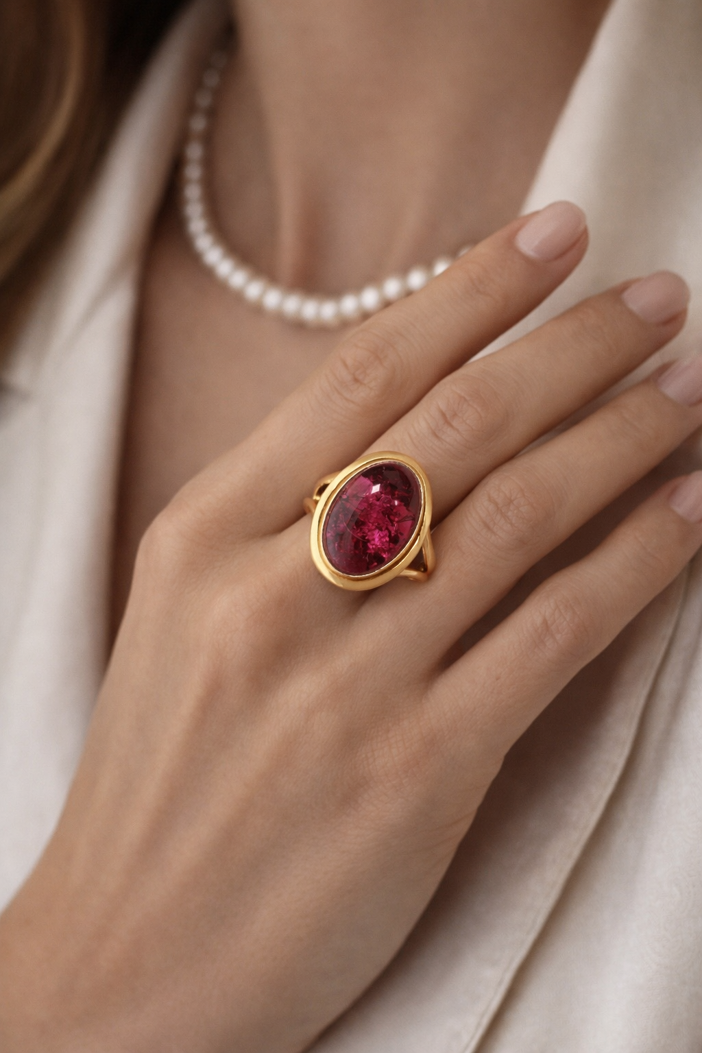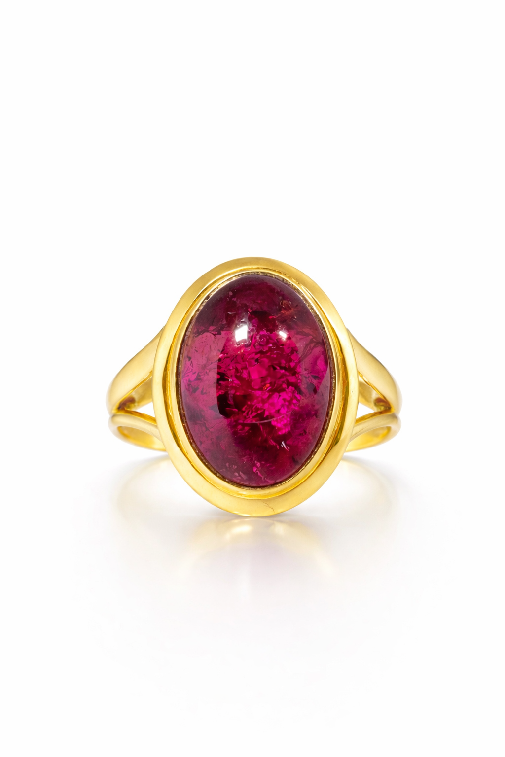 Bold, romantic, and unmistakably luxurious, The Verona Tourmaline Ring is a striking statement piece crafted for those who appreciate rare colour and timeless design. Set in rich polished yellow gold, this elegant ring features a captivating oval rubellite tourmaline, celebrated for its deep raspberry-red hue and luminous natural character.
