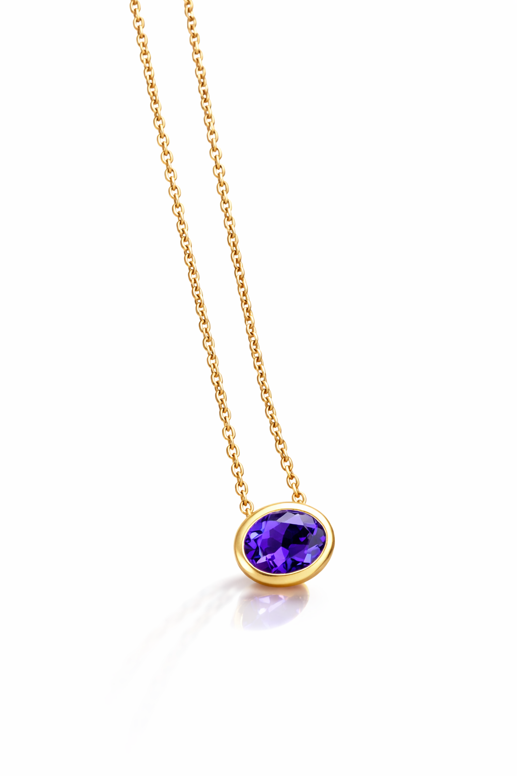 The Violetta Lumière Pendant is a refined expression of modern elegance, designed to glow with quiet confidence. At its heart, a richly saturated oval-cut amethyst captivates with deep violet hues, delicately framed by a halo of shimmering diamonds. Crafted in warm rose gold, the setting enhances the gemstone’s natural brilliance while adding a romantic, contemporary touch.
